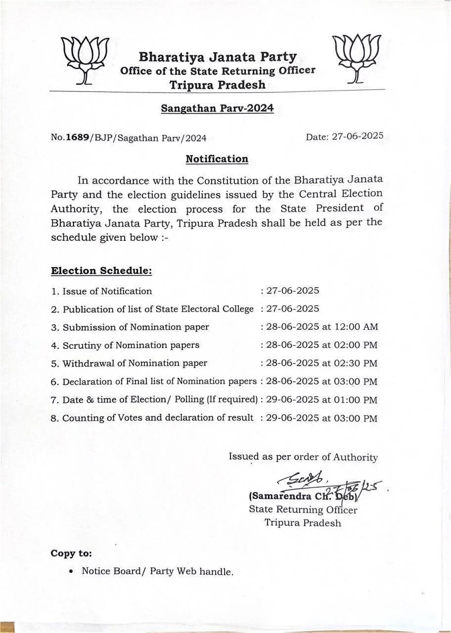 আগরতলা, ২৭ জুন ২০২৫: ভারতীয় জনতা পার্টির সংবিধান এবং কেন্দ্রীয় নির্বাচন কর্তৃপক্ষ কর্তৃক জারি করা নির্বাচনী নির্দেশিকা অনুসরণ করে ত্রিপুরা প্রদেশ বিজেপির রাজ্য সভাপতি নির্বাচনের প্রক্রিয়া আনুষ্ঠানিকভাবে শুরু হয়েছে। আজ, ২৭শে জুন, বৃহস্পতিবার রাজ্য বিজেপির তরফ থেকে বিজ্ঞপ্তি জারি করে সম্পূর্ণ নির্বাচনী সময়সূচী ঘোষণা করা হয়েছে।