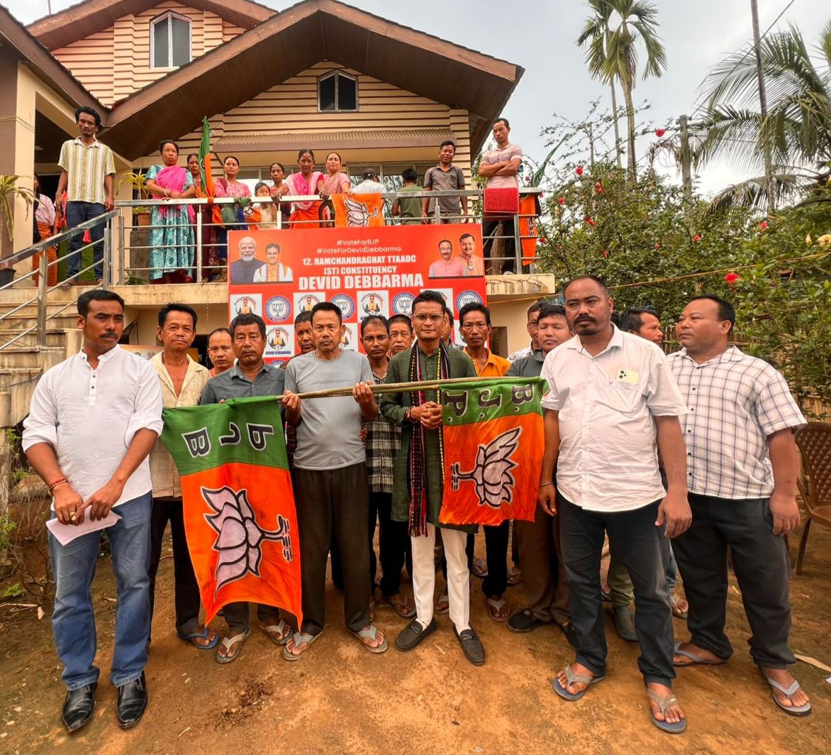 নিজস্ব প্রতিনিধি, রামচন্দ্রঘাট: ১২ নং রামচন্দ্রঘাট TTAADC বিধানসভা কেন্দ্রে রাজনৈতিক সমীকরণে বড়সড় বদল। আজ এক বিশেষ অনুষ্ঠানের মধ্য দিয়ে প্রাক্তন এনএলএফটি (NLFT) ও এটিটিএফ (ATTF)-এর মোট ৬৪ জন প্রত্যাগত ভোটার ভারতীয় জনতা পার্টিতে (বিজেপি) আনুষ্ঠানিকভাবে যোগদান করেছেন। শ্রী ডেভিড দেববর্মার নেতৃত্বে এই বিশাল যোগদান কর্মসূচি সম্পন্ন হয়।
